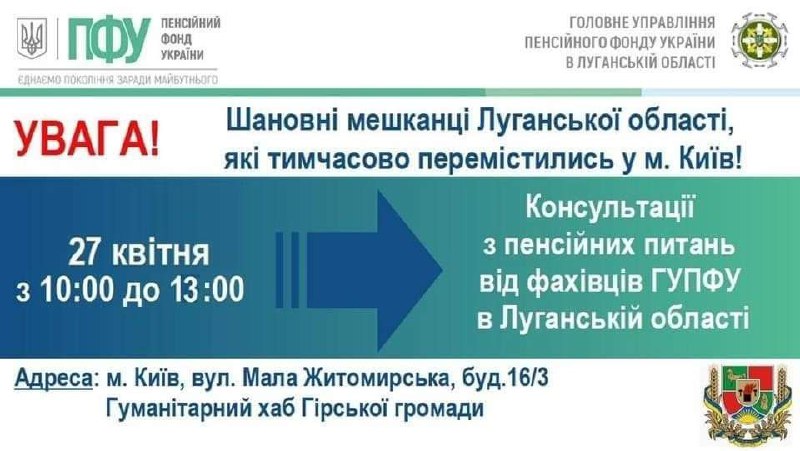 Звернутись за вирішенням пенсійних питань можна з 10:00 до 13:00 до хабу Гірської громади за адресою: м.Київ, вул. Мала Житомирська, буд. 16/3.