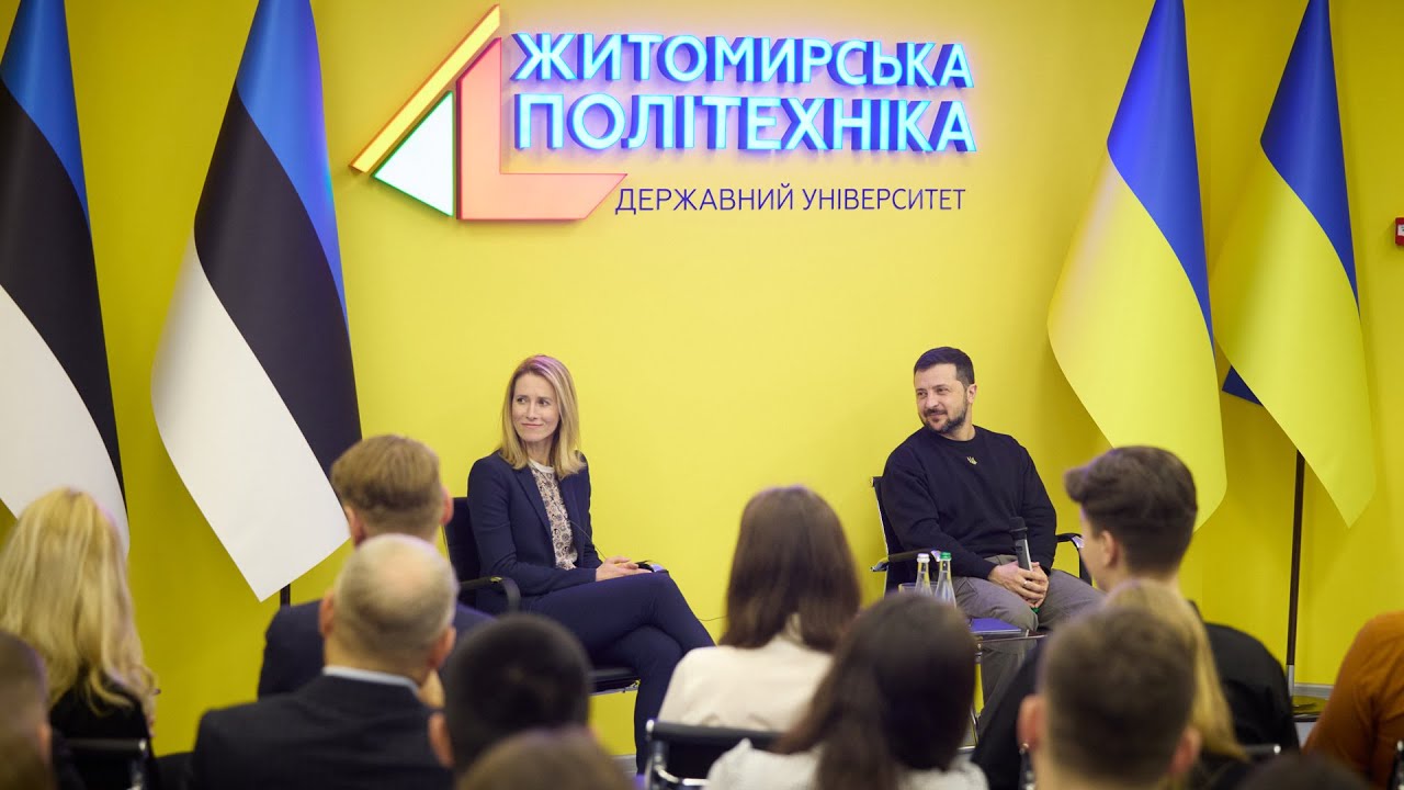 Під час робочої поїздки на Житомирщину Президент України Володимир Зеленський і Прем’єр-міністр Естонської Республіки Кая Каллас відвідали Державний університет «Житомирська політехніка» та поспілкувалися зі студентською спільнотою.