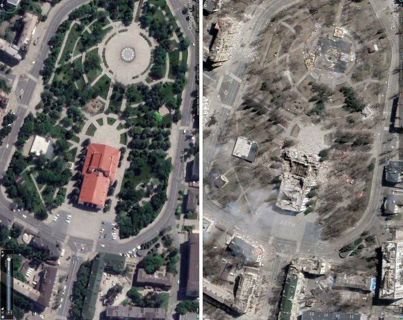 😣Завдяки оновленим супутниковим знімкам у Google maps, можна побачити, що «асвабадітєлі» зробили з Драматичним театром. До повномасштабного вторгнення – тут була ціла будівля, де ставили спектаклі та доглянутий парк. На Театральній площі проходили концерти та фестивалі. Навколо були багатоповерхівки, де вирувало життя.