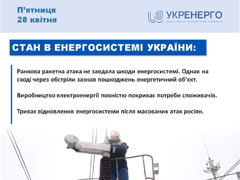Станом на 28 квітня виробництва електроенергії достатньо для покриття споживання. Водопілля спадає. Гідроелектростанції продовжують працювати не тільки для покриття піків споживання зранку та ввечері, але й упродовж всієї доби.