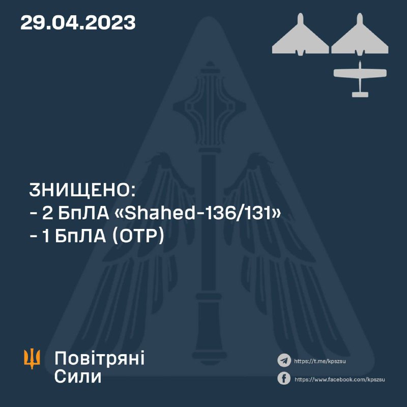 29 квітня 2023 року близько 4 год ранку силами та засобами повітряного командування "Схід"Повітряних Сил ЗС України знищено два ударних БпЛА типу "Shahed".
