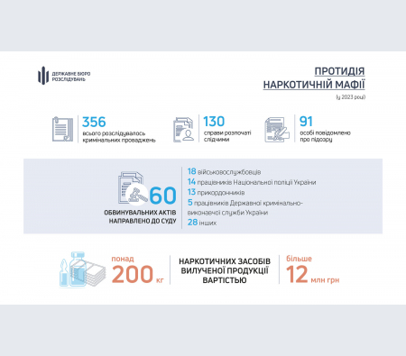 У межах протидії розповсюдженню наркотиків, ДБР у цьому році вже повідомило про підозру 91 особі, причетній до цих злочинів. При цьому до суду було направлено 60 обвинувальних актів стосовно 78 осіб.