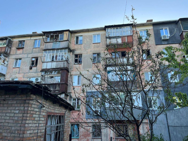 Пошкодженi адмінбудівля, п'ятиповерхiвка, 3 приватнi житловi будинки, господарська споруда.