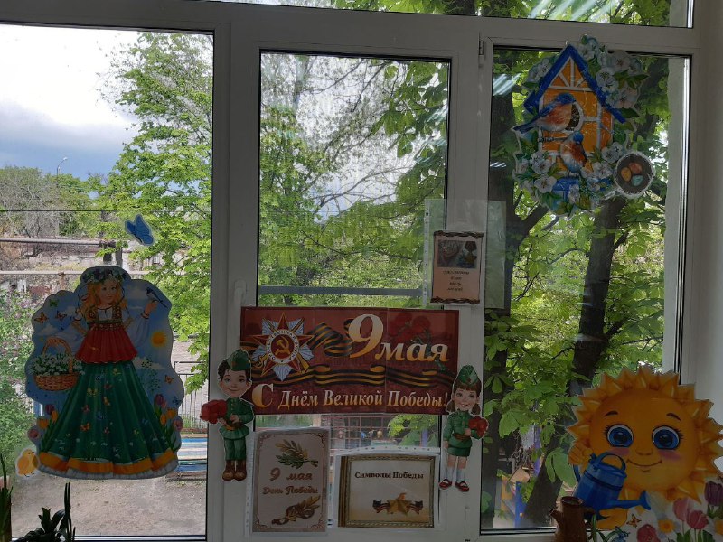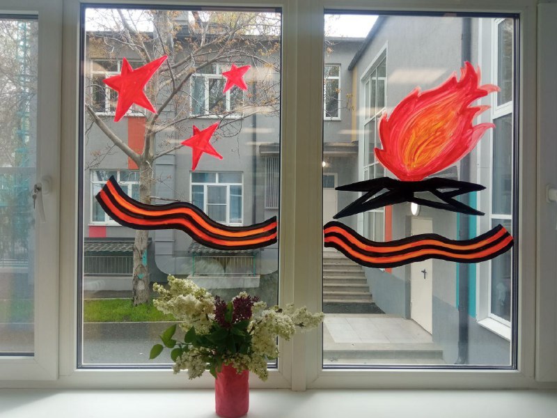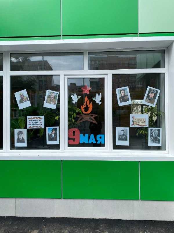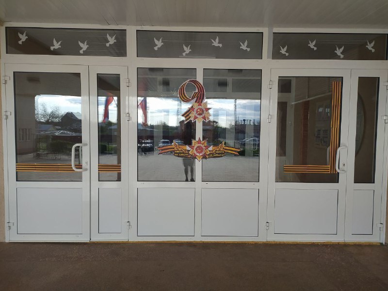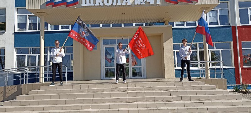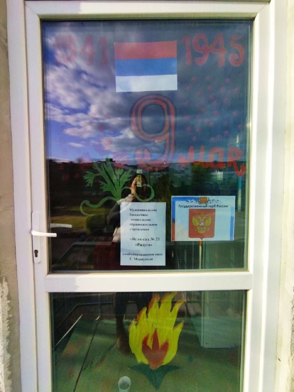 😖Школи в окупованому місті змусили підготуватися до 9 травня у дусі російської пропаганди. Заклади освіти розклеїли на вікнах георгіївські стрічки, герб СРСР, лозунги «Спасибо деду за победу!». А у школі №47 змусили учнів розмахувати прапорами СРСР, росії та «днр».