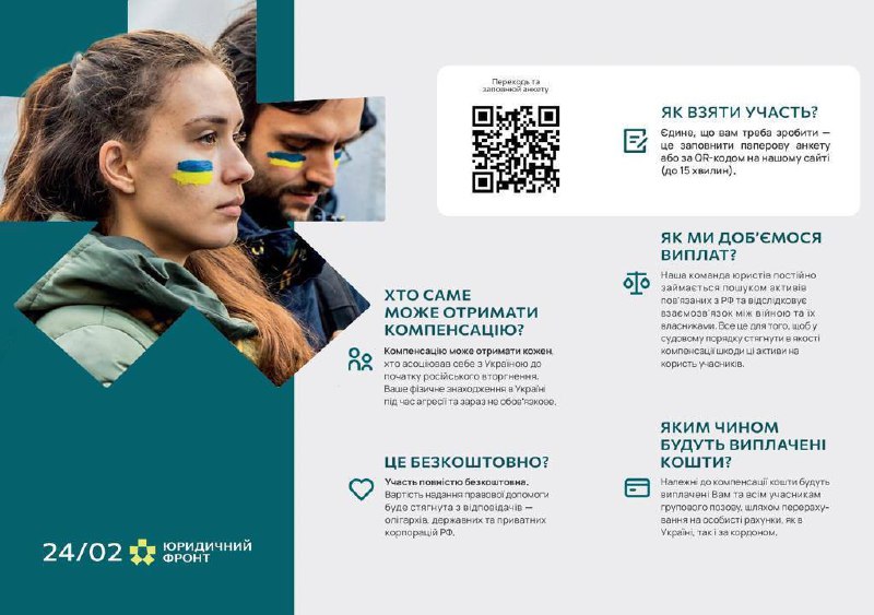 ☝️Домогтися фінансових компенсацій з боку рф на користь постраждалих під час війни намагається некомерційна організація "Юридичний фронт 24/02". Для цього вона об’єднала в єдину команду найдосвідченіших юристів України та почала збирати учасників для судового позову.