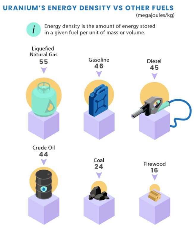 Збагачений уран-235 – паливо, яке використовується в ядерних реакторах – містить 3,9 млн мегаджоулів енергії на кілограм ваги. Саме тому відносно невелика кількість ядерного палива може виробляти значну кількість енергії.