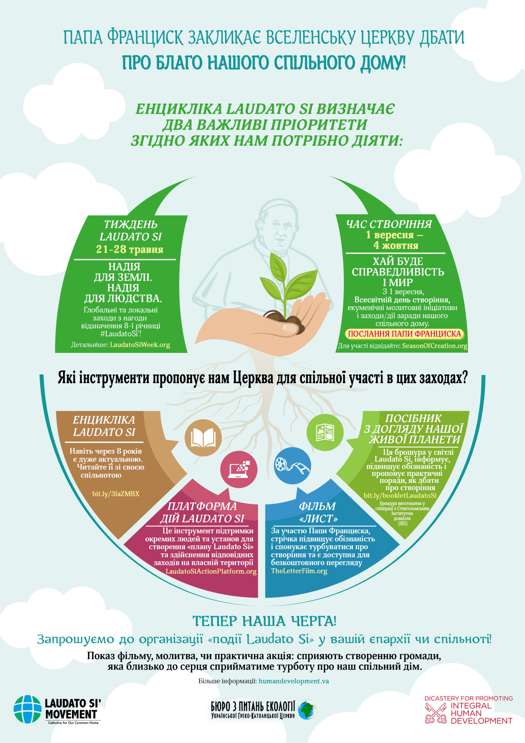 Дикастерія Святого Престолу для сприяння цілісному розвитку людини закликає Вселенську Церкву, парафіяльні громади та усіх віруючих людей взяти участь у «Тижні Laudato Si» (21-28 травня) та «Часі створіння» (1 вересня – 4 жовтня), виявляючи таким чином свідомість відповідальності за створений Богом світ.