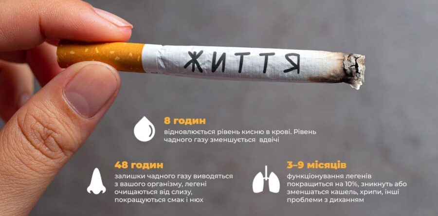 Відмова від залежностей, а тютюнокуріння – це залежність, може бути непростою справою. Тож зверніться по допомогу до сімейного лікаря. Крім того, намагайтеся залучити до своєї трансформації якомога більше знайомих і друзів, щоби в разі потреби отримати підтримку. Пам’ятайте, що навіть найдовший шлях починається з першого кроку. Тож без вашого твердого наміру відмовитися від куріння змін не відбудеться. Розкажіть про свої наміри друзям Саме родина та інші близькі вам люди можуть стати для вас опорою і заохотити продовжувати розпочате, особливо коли виникає спокуса закурити. Дайте собі відповідь на запитання «Чому я хочу кинути курити?» Мотивація має бути зрозумілою саме вам. Наприклад, ви очікуєте на народження дитини і не хочете, щоби вона ставала пасивним курцем. Або хочете пробігти півмарафон, а куріння не дає покращити бажаний результат. Пообіцяйте собі винагороду за те, що вам вдалося кинути курити «Поїхати на вихідні в гори», «купити щось на заощаджені гроші», «зробити найбільший донат тим, хто цього потребує» – подумайте, чого вам хочеться, і нехай ця мета веде вас до успіху. Уникайте стресу і потенційно тригерних ситуацій Звісно, в часи війни не йдеться про спокійне життя, але ви можете навчитися опановувати себе і хоча би трохи знижувати тривожність. Складіть план на випадок, якщо вам захочеться закурити. Наприклад: 1) почекати 15 хвилин; 2) відволіктися на роботу чи цікаву розмову; 3) з’їсти шматок яблука; 4) послухати улюблену пісню; 5) попросити про підтримку друга, якому довіряєте. Дотримуйтеся цього плану щоразу, як матимете спокусу викурити цигарку. Не здавайтеся!