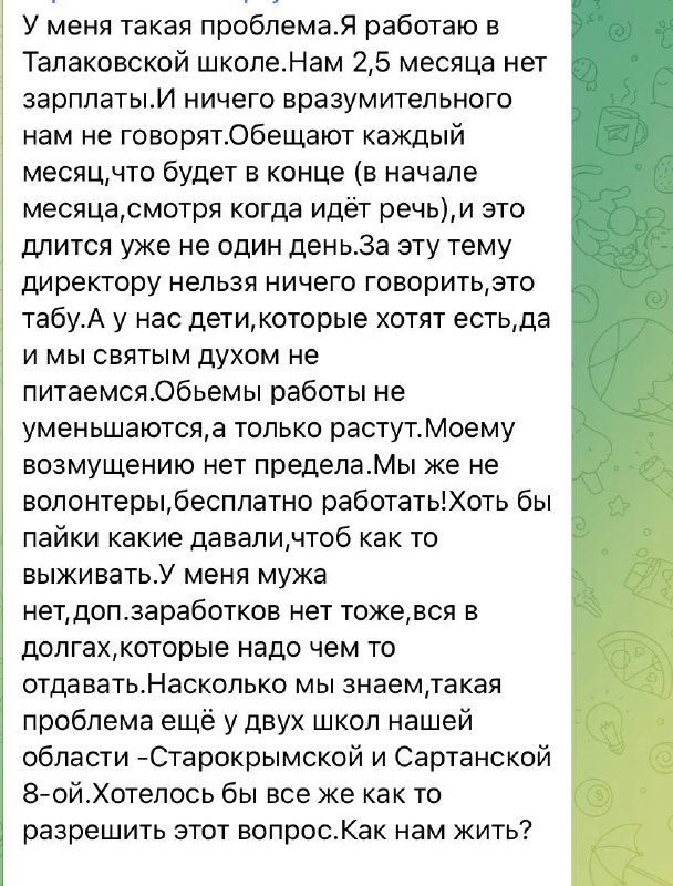 ✍️Про це пишуть самі вчителі. Зокрема, повідомляє працівниця школи у селищі Талаківка, поблизу Маріуполя. Жінка зазначає, що вже понад 2 місяців співробітники працюють безкоштовно. Така ж ситуація у Старому Криму та Сартані.