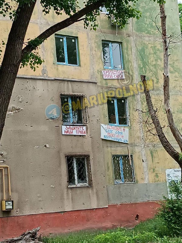 😠"Зупиніть знесення будинку", "Захистіть наші права". Плакати з такими написами вивісили з вікон жителі багатоповерхівки по вулиці Зелінського, 21. Люди хочуть врятувати рідні домівки. Проте окупаційна адміністрація не реагує на звернення.