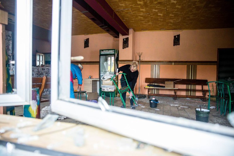 У місцевому кафе прибирають скло від вибитих вікон. Власники закладу – переселенці з Гуляйполя. Кажуть, їх прийняли, як рідних, тож нікуди не поїдуть. Будуть відновлювати бізнес.