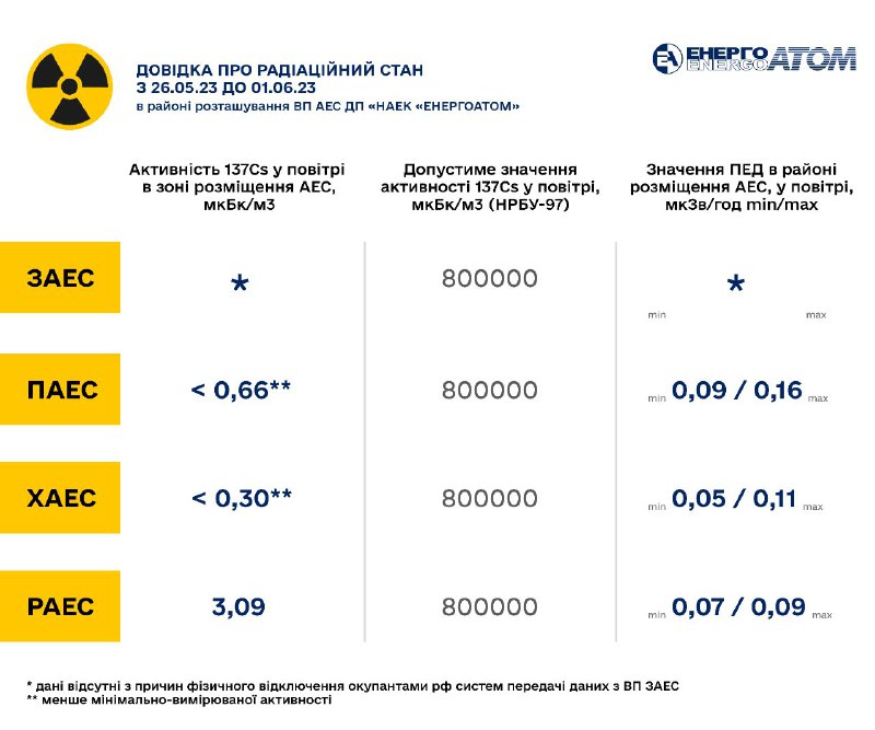 ☢️ Довідка про радіаційний стан у період з 26 травня по 1 червня 2023 року в районі розташування ВП АЕС ДП «НАЕК «Енергоатом»