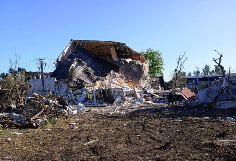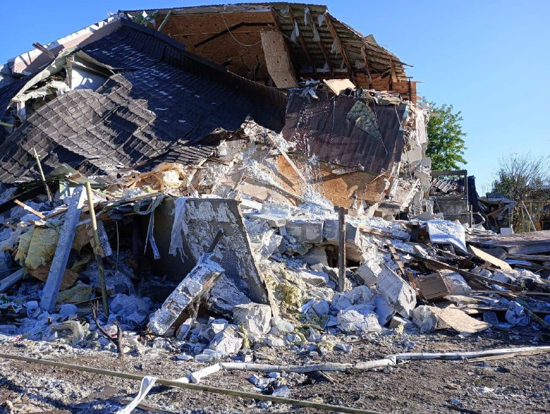 Дві двоповерхівки, між якими влучила ворожа ракета, частково зруйновані. Пошкоджені й 10 приватних будинків, авто, магазин, газопроводи.