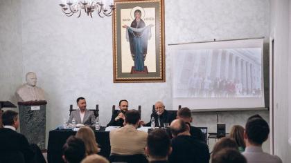 Першим заходом, який провели у відновленому залі, стала міжрелігійна конференція «Релігія і діалог», участь у якій взяли о. Луїс Касіано, ректор колегії, рабин Джек Бемпорад, керівник Центру міжрелігійного порозуміння, Дімітріос Керамідас, професор Інституту Екуменічних Студій Папського університету святого Томи Аквінського «Angelicum», Тарас Дзюбанський, науковий дослідник Центру Коллінс від Інституту Актон та директор Центру міжконфесійного та міжрелігійного діалогу «Лібертас», о. Лоран Базанезе, представник Дикастерії з питань міжрелігійного діалогу. Слухачами конференції стали учасники програми «Діалог», колегіанти та запрошені гості.