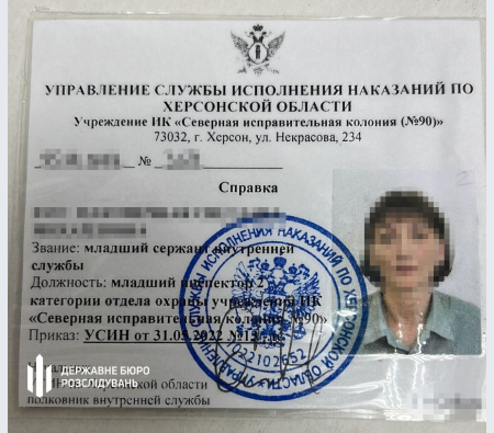 Крім того, ДБР викрило на державній зраді інспекторку херсонської колонії, яка досі прислуговує окупантам. Молодший інспектор відділу охорони Державної установи «Північна виправна колонія № 90» добровільно пішла на службу до ворога. Вона погодилася обійняти подібну посаду в незаконно створеному правоохоронному органі окупаційної влади – Управлінні служби виконання покарань.