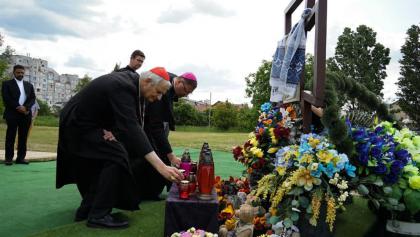 Італійський кардинал у супроводі архієпископа Вісвальдаса Кульбокаса відвідав храм Андрія Первозванного, місце масового поховання невинно вбитих мешканців (119 осіб) та оглянув фотовиставку, що розповідає про звірства окупантів.