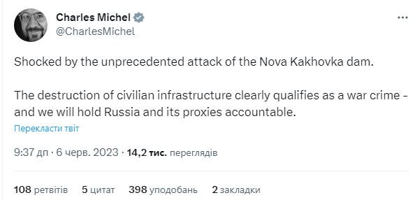 «Шокований безпрецедентною атакою на дамбу Нової Каховки. Руйнування цивільної інфраструктури однозначно кваліфікується як воєнний злочин, і ми притягнемо росію та її маріонеток до відповідальності», – написав Президент Європейської радиШарль Мішель у Twitter.