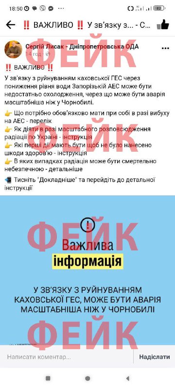 рашистські гниди не сплять. Сьогодні були створені фейкові сторінки ряду очільників ОВА! путіністи хочуть посіяти паніку серед українців 8.06.2023, Четвер | 21:19 Автор допису: Голова Дніпропетровської обласної військової адміністрації рашистські гниди не сплять. Сьогодні були створені фейкові сторінки ряду очільників ОВА! путіністи хочуть посіяти паніку серед українців. Не вийде! Ми добре знайомі з інформаційною гігієною. Забанимо в мережі. Знищимо на полі бою! Джерело Друк / PDF