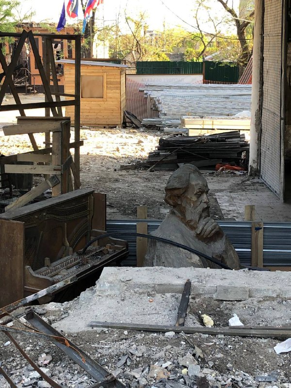 😢Багатоповерхівки у самому центрі досі розбиті. Зокрема, де колись був Центр сучасного мистецтва та культури ім. Куїнджі. Галерея повністю розтрощена. Бюст видатного маріупольського художника кинули до сміття.