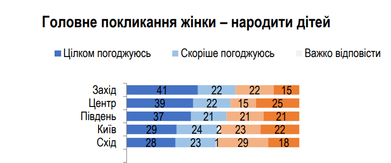 Так, згідно з дослідженням, саме мешканці заходу України найбільш прихильні до думки про материнство як головне покликання жінки. Загалом до цієї думки схиляються 63% опитаних мешканців західних регіонів. На другому місці опинилися центральноукраїнські області. Їхній показник – 61%. На сході ситуація найгірша: там із цією думкою погоджується 51%, не погоджуються – 47% (натомість на заході не погоджуються 37%).