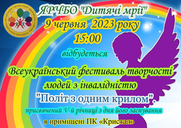 БО “Дитячі Мрії” та ГО “Регіна” запрошують на Всеукраїнський фестиваль творчості людей з інвалідністю “Політ з одним крилом” присвячений V-й річниці з дня його заснування. Вже завтра, 9 червня, в приміщенні Палац культури “Kристал” м.Новояворівськ Початок о 15:00