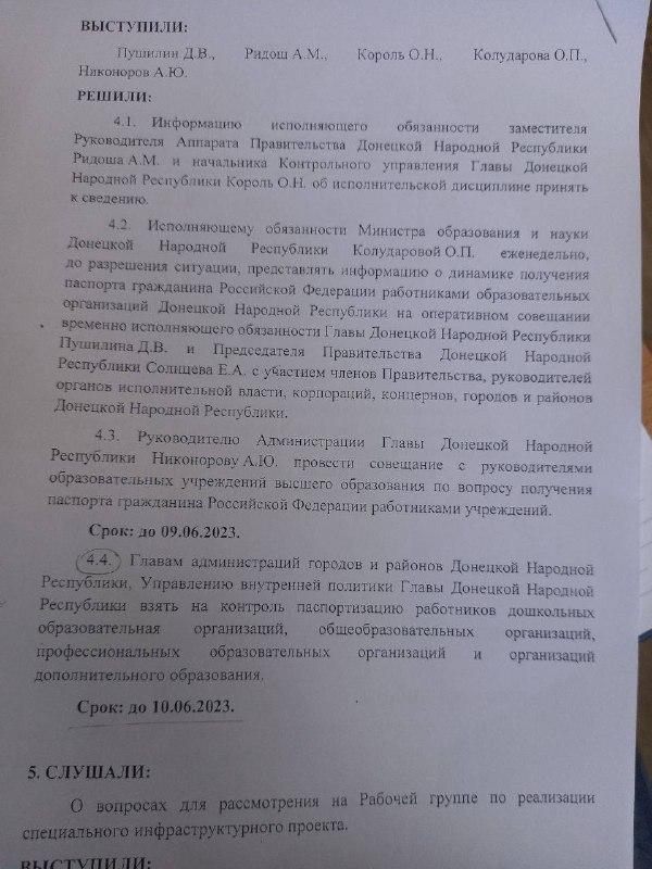 Зокрема, вчителів змушують отримувати російські паспорти. У разі відмови – лякають звільненням. Про це йдеться у розпорядженні, яке виклали у місцевих пабліках. Документ підписаний пушиліним та стосується Нікольського району. Згідно з ним, колабораційним адміністраціям поставлено строк до 10 червня взяти на контроль паспортизацію співробітників освітніх установ.