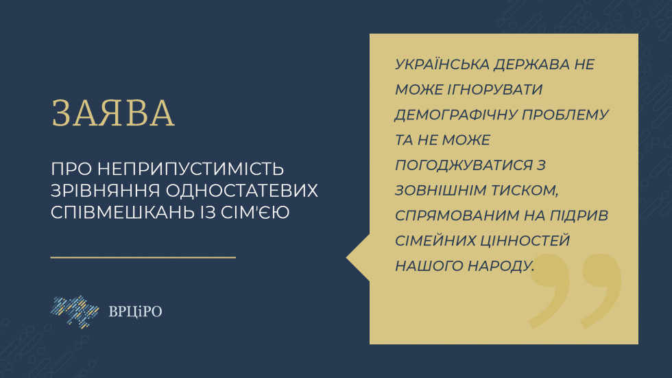 Заява ВРЦіРО про неприпустимість зрівняння одностатевих співмешкань із сімʼєю