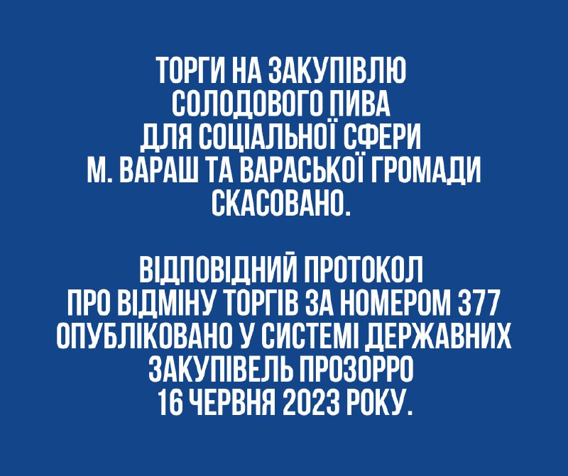 ℹ️ Рівненська АЕС скасувала оголошені торги. Відповідний протокол оприлюднили у системі державних закупівель Prozorro. 16.06.2023, П’ятниця | 17:06 Автор допису: Енергоатом ℹ️ Рівненська АЕС скасувала оголошені торги. Відповідний протокол оприлюднили у системі державних закупівель Prozorro. t.me/rnppofficial/6344 #РАЕС | FB | IG | YT | TW | | EA Рівненська АЕС – Telegram Джерело Друк / PDF