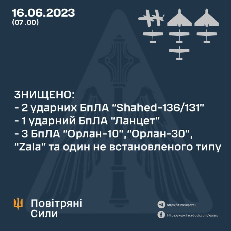 💥 Також за минулу добу захисники неба знищили ворожий ударний БпЛА «Ланцет», «Орлан-10», «Орлан-30», «Zala» та один БпЛА не встановленого типу.