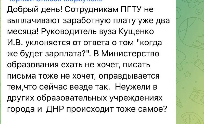 "Керівник вишу Кущенко І.В. ухиляється від відповіді про те "коли ж буде зарплата? Писати листи теж не хоче, виправдовується тим, що зараз скрізь так", – пишуть маріупольці.