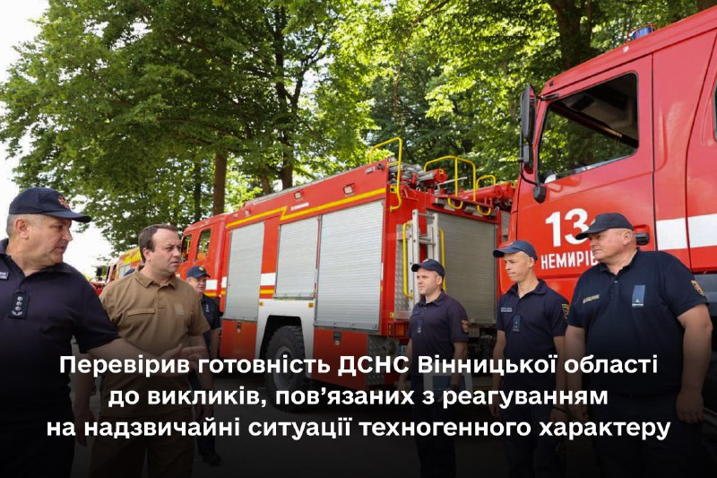 Перевірив готовність ДСНС Вінницької області до викликів, пов’язаних з реагуванням на надзвичайні ситуації техногенного характеру 26.06.2023, Понеділок | 17:23 Автор допису: Голова Вінницької обласної військової адміністрації Перевірив готовність ДСНС Вінницької області до викликів, пов’язаних з реагуванням на надзвичайні ситуації техногенного характеру Усі технічні засоби та особовий склад спеціалізованого зведеного загону готові до виконання завдань за призначенням. Оглянув пульт управління операціями, мобільні пункти життєзабезпечення: харчоблок, їдальню, спальні місця, душові та пункт надання медичної допомоги. Рятувальна техніка та особовий склад у повній готовності до гасіння великих лісових пожеж і ліквідації радіаційних або хімічних аварій. Дякую за оперативність і професійність! Джерело Друк / PDF