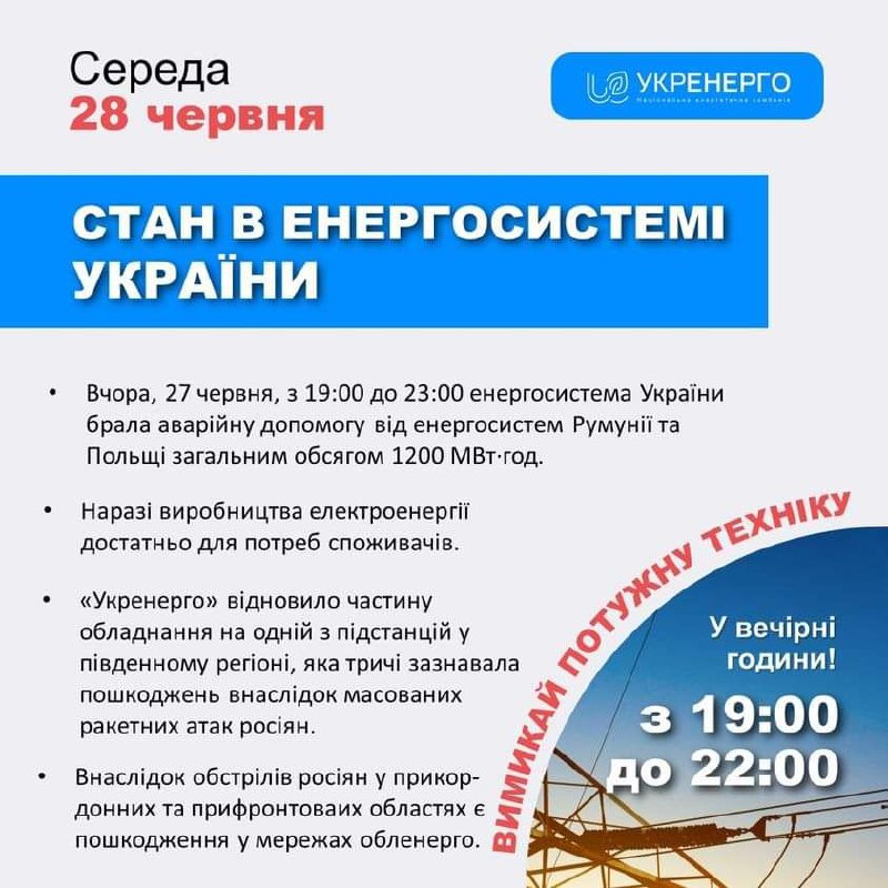 📌БАЛАНС В ЕНЕРГОСИСТЕМІ. Вчора, 27 червня, з 19:00 до 23:00 через недостатність загальної потужності українських електростанцій для покриття вечірнього споживання енергосистема України брала аварійну допомогу від енергосистеми Румунії та Польщі по 150 МВт щогодини загальним обсягом 1200 МВт·год.