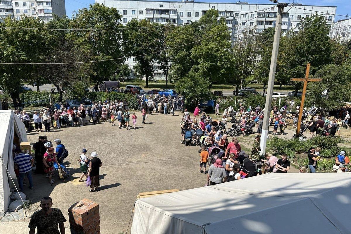 Щочетверга від самого ранку біля катедрального собору Святого Миколая Чудотворця Української Греко-Католицької Церкви у м. Харкові стоїть кількасотметрова черга людей. Тут раз на тиждень всім, хто потребує, видають гуманітарну допомогу.