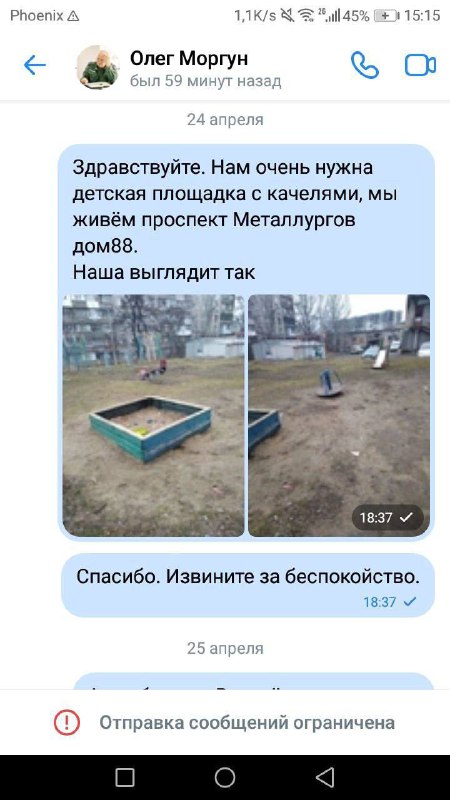 Тож мешканці пишуть повідомлення до псевдомера міста моргунова з проханням відремонтувати дитячі майданчики. Але одразу такі повідомлення блокуються. Бо ніхто не хоче чути людей, у "руському мирі" не має місця демократії та власній думці.