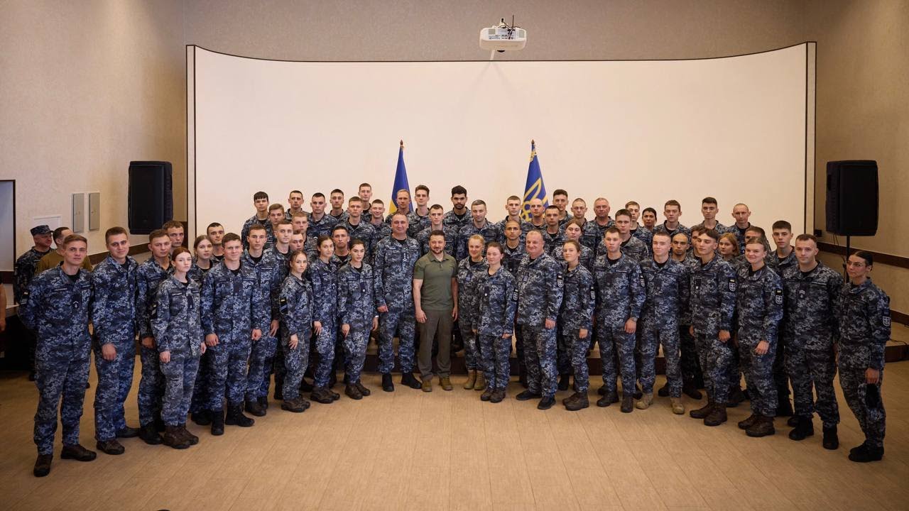 «Сьогодні для всіх українців абсолютно не якась там формальність – дякувати вам. Ми знаємо, ми бачили і ми вдячні за ту славу, яку здобувають для нашої держави складові наших Військово-Морських сил. Ми всі в Україні впевнені у вашій міцності, у вашій професійності та у вашій здатності й надалі демонструвати українську силу. Доля України – безперечно, бути міцною. Бути вільною частиною вільного світу. Я впевнений, що Україна захистить себе у цій війні та поверне усе своє, що поки контролюють окупанти. А після війни Україна перемоги – навчатиме інших у світі міцності, зокрема й на морі, навчатиме захисту свободи. Україна стане донором глобальної безпеки і глобальної сили, і я вірю, що ваші знання, хлопці, ваша сила, ваші майбутні перемоги наблизять цей могутній час для нашої прекрасної України. Слава Військово-Морським силам Збройних Сил України! Слава вашим сім’ям, вашим рідним, які виховали для України таких класних синів! Слава Україні!»