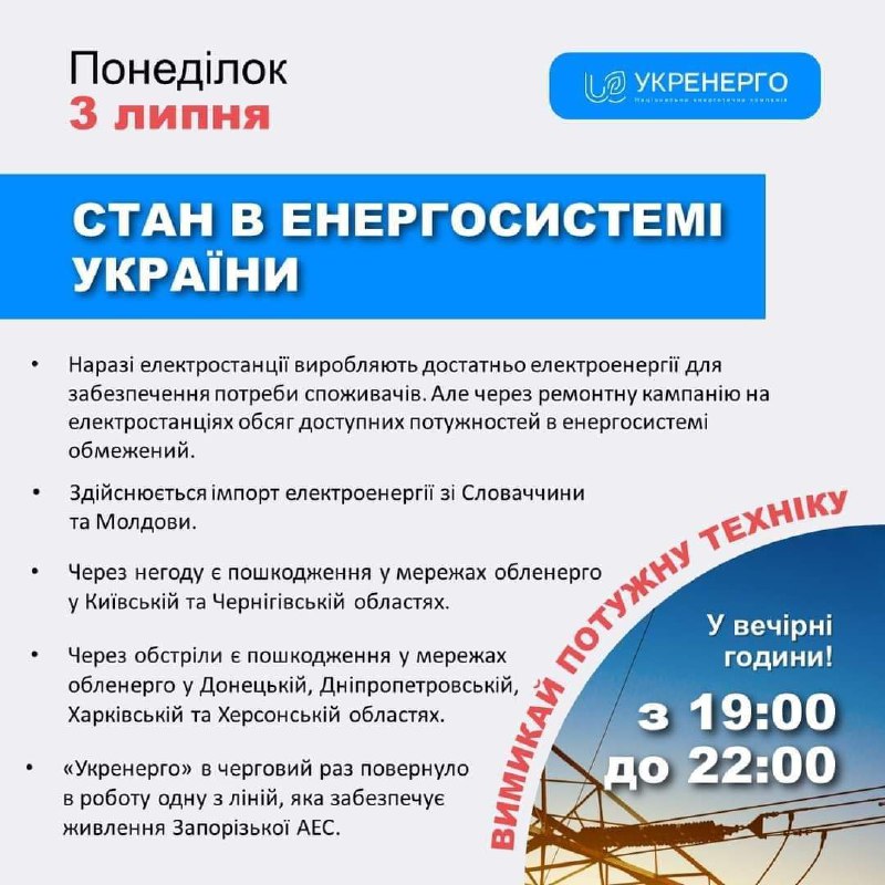 📌БАЛАНС В ЕНЕРГОСИСТЕМІ. Наразі електростанції виробляють достатньо електроенергії, щоб забезпечити потреби споживачів. Однак все ще триває ремонтна кампанія на теплових і гідроелектростанціях, деяких атомних енергоблоках. Тому обсяг доступних потужностей в енергосистемі для виробництва електроенергії обмежений, особливо у вечірні години, коли споживання найбільше.
