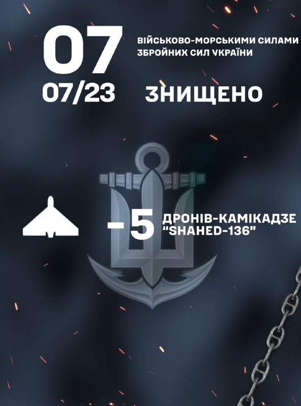 Вночі військові моряки знищили 5 ударних дронів “Shahed-136” В зоні відповідальності 7.07.2023, П’ятниця | 9:44 Автор допису: Військово-Морські Сили Збройних Сил України Вночі військові моряки знищили 5 ударних дронів "Shahed-136" В зоні відповідальності, особовим складом Військово-Морських Сил ЗС України було збито чергові ворожі дрони-камікадзе "Shahed-136". Не зважаючи на ніч, українські захисники влучно поцілили в п'ять ворожих дронів та відбили атаку ворога. Слава Україні! Джерело Друк / PDF