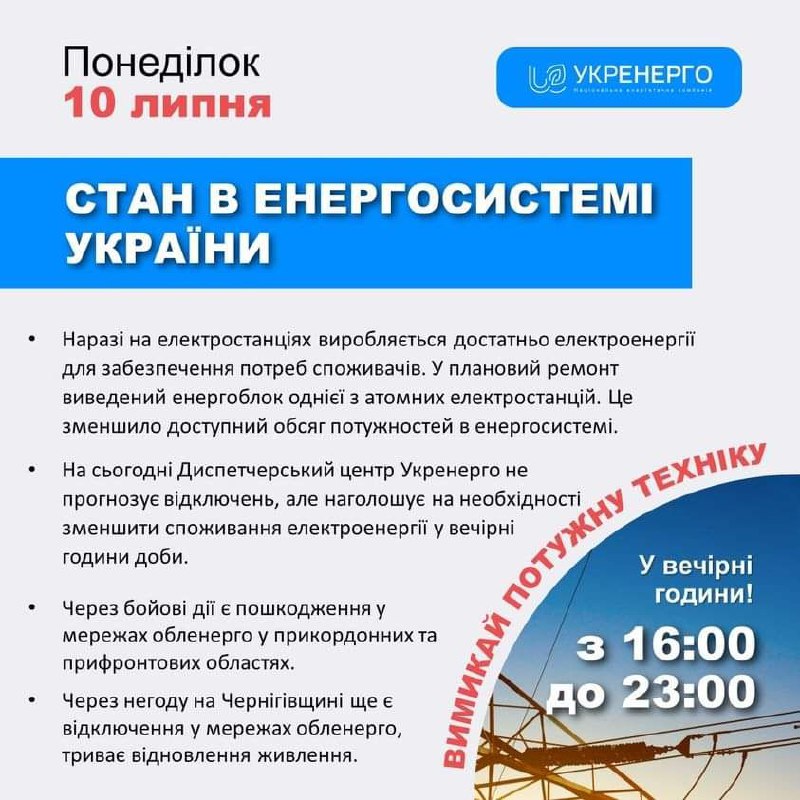Ситуація ускладнилася тим, що у неділю, 9 липня, у плановий ремонт виведений енергоблок однієї з атомних електростанцій. Це зменшило доступний обсяг потужностей в енергосистемі.