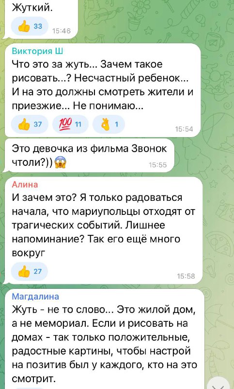 "Це житловий будинок, а не меморіал", "Що це за жах? Навіщо таке малювати?", "Не картина, а надгробок якийсь", "Треба узгоджувати такі речі з жителями будинку", – пишуть маріупольці.