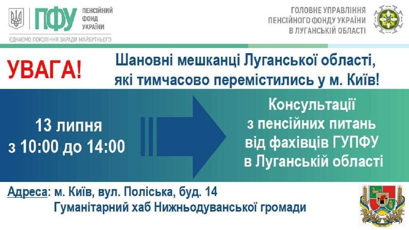 Звернутися за вирішенням пенсійних питань можна з 10:00 до 14:00 до гуманітарного хабу Нижньодуванської громади за адресою: м. Київ, вул. Поліська, буд. 14.