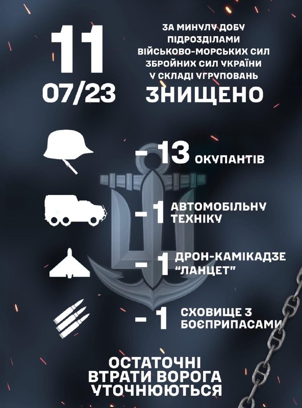Минулої доби, підрозділами ВМС ЗС України знищено 13 окупантів, 1 одиницю автомобільної техніки, 1 дрон-камікадзе "Ланцет" та 1 сховище з боєприпасами.