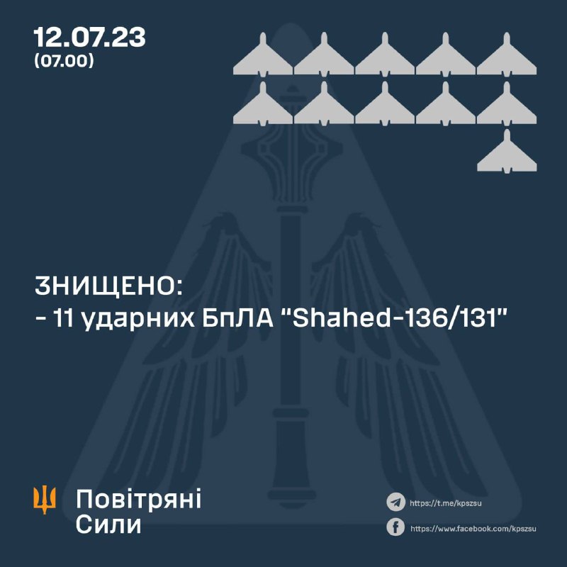 Доброго ранку всій Україні! Сьогодні вночі російські окупанти атакували Україну дронами – камікадзе 12.07.2023, Середа | 9:38 Автор допису: Голова Кіровоградської обласної військової адміністрації Доброго ранку всій Україні! Сьогодні вночі російські окупанти атакували Україну дронами – камікадзе. 11 – знищили оборонці неба. На Кіровоградщині обстановка під контролем. Дякуємо нашим славним Збройним Силам України за те, що ми живі!Разом ми сильні! Україна переможе! 🇺🇦💪 Джерело Друк / PDF