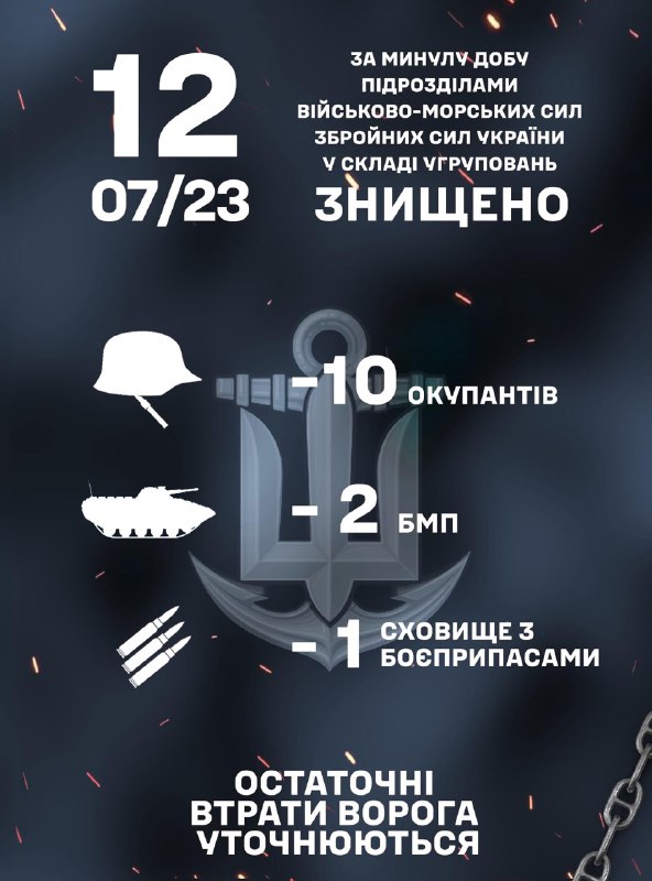 Минулої доби, підрозділами ВМС ЗС України знищено 10 окупантів, 2 бойові машині піхоти та 1 сховище з боєприпасами.