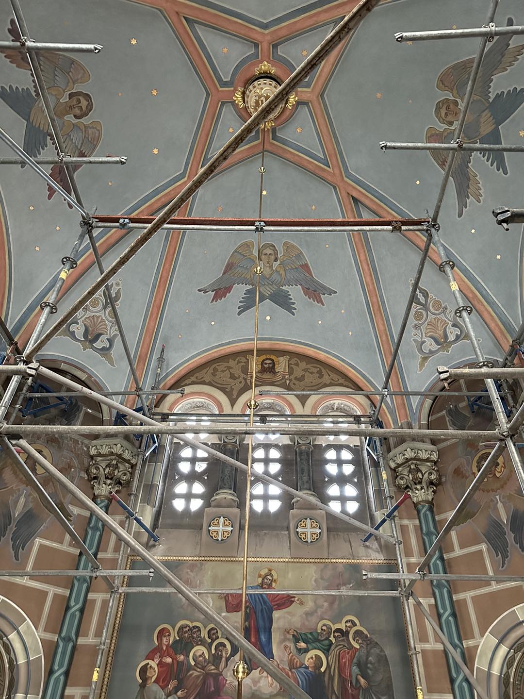 ― Нещодавно відбулася презентація відреставрованого склепіння храму. Роботи тривали два роки. Насправді ця історія розпочалася ще 80 років тому, коли в час Другої світової війни це склепіння було понищене кулями. Через отвори в храм затікала вода і руйнувала розписи. З часом вони почали осипатися. Проаналізувавши ситуацію, ми вирішили проводити реставрацію. Під тими малюнками виявили давні розписи візантійського стилю. Тож, прагнучи зберегти те, що було, ми виявили ще цінніші розписи. Вони були зафарбовані в два шари масляними фарбами і зверху нанесені досить примітивні малюнки. На даль, авторства віднайдених розписів ще не встановили. Та ми й надалі продовжуватимемо реставрацію, тож, сподіваємося, що все таки вдасться знайти якісь підписи, ― пояснив отець Михайло.