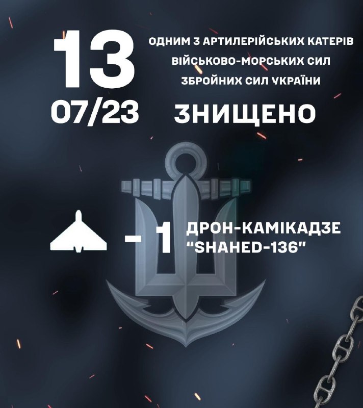 Військові моряки знищили черговий дрон-камікадзе Сьогодні вночі особовим складом одного з катерів Військово-Морських… 13.07.2023, Четвер | 9:42 Автор допису: Військово-Морські Сили Збройних Сил України Військові моряки знищили черговий дрон-камікадзе Сьогодні вночі особовим складом одного з катерів Військово-Морських Сил ЗС України знищено дрон-камікадзе "Shahed-136". Слава Україні! Джерело Друк / PDF