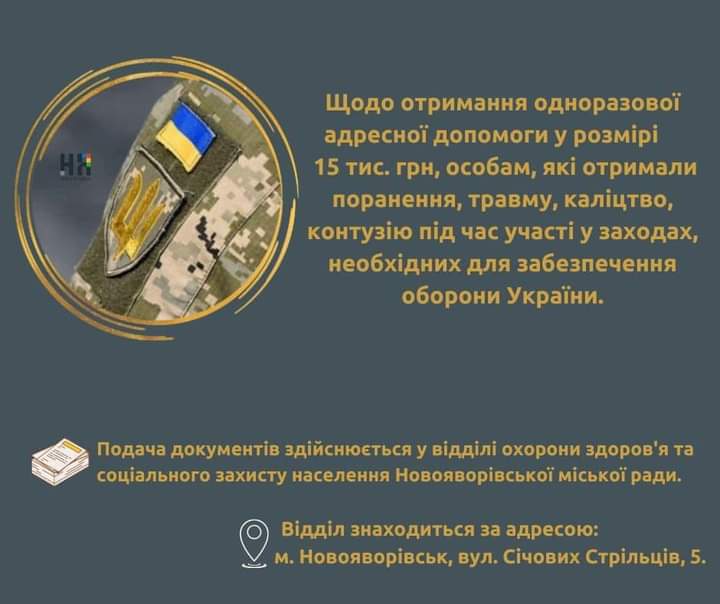 Новояворівська міська рада нагадує, що починаючи з листопада 2022 року, коштом міського бюджету надається одноразова адресна допомога у розмірі 15 тис. грн, особам, які отримали поранення, травму, каліцтво, контузію під час участі у заходах, необхідних для забезпечення оборони України. ▪️За отриманням допомоги необхідно звернутись у Відділ охорони здоров’я та соціального захисту населення Новояворівської міської ради з необхідним пакетом документів. Відділ знаходиться за адресою: м. Новояворівськ, вул. Січових Стрільців, 5. Також інформуємо, що відтепер можна отримати виплати з обласного бюджету! Захисники та Захисниці України, яким у зв’язку з пораненням або захворюванням встановлено статус “особи з інвалідністю внаслідок війни” можуть отримати матеріальну допомогу з обласного бюджету на реабілітацію. ▪️Що для цього потрібно? Мати статус особи з інвалідністю внаслідок російсько-української війни та бути зареєстрованим на території Львівської області. ▪️Отримати можна? I група – 25 тис. грн II група – 15 тис. грн III група – 10 тис. грн ▪️Як часто? Один раз протягом року (за умови підтвердження використання коштів). ▪️Перелік документів? Заява, копія посвідчення особи з інвалідністю внаслідок війни, копію документа, що підтверджує безпосередню участь у війні, копію індивідуальної програми реабілітації, копію паспорта та ідентифікаційного номеру, реквізити особового банківського рахунку. ▪️Куди звертатися? Для отримання допомоги від обласного бюджету, необхідно звернутись у Відділ охорони здоров’я та соціального захисту населення Новояворівської міської ради за вищевказаною адресою. *Реабілітація може бути різною (медична, психологічна, тренажерний зал, іпотерапія). Ціль – покращення фізичного та ментального здоров’я. ** Допомогу можна використовувати на заходи реабілітації разом з дружиною (чоловіком). ***Щоб скористатися заходом у наступних роках треба надати підтвердження, що 75 % від суми було витрачено на реабілітацію.
