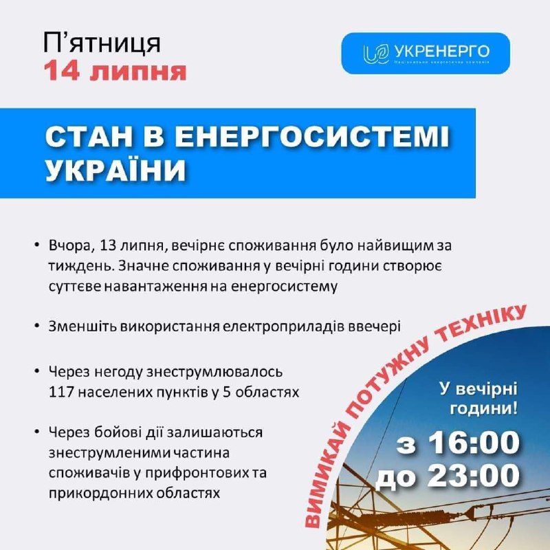 Вчора, 13 липня, вечірнє споживання було найвищим за тиждень через спекотну погоду і зросло на 5%, порівняно з середою, 12 липня. Це суттєве навантаження на енергосистему у вечірні години, яке вказує на недостатність заходів економії електроенергії.