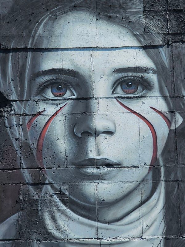 ☝️Італійський художник Jorit написав портрет дівчинки на 9-поверхівці у районі Кірова. На стіні зображена дівчина Настя, яку він побачив на одній з рашистських пропагандистський виставок. За ідеєю художника, у дівчини йдуть сльози від того, що на неї «падають снаряди НАТО».