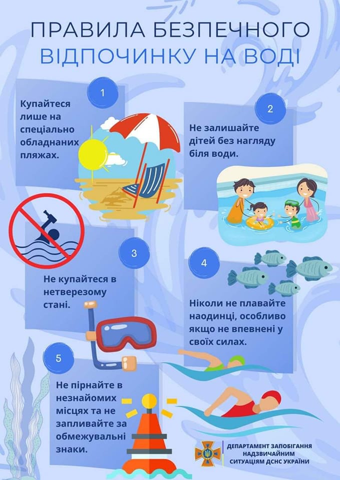 В спекотні дні немає кращого місця для відпочинку, ніж біля водойм. Там можна насолодитися теплом сонця, освіжитися приємним купанням. Але, як і в усьому, безпека має першочергове значення.Ми занадто часто стикаємося з ситуаціями, коли відпочивальники нехтували правилами безпеки на воді.Так, з початку року на водоймах на території Львівської області виявлено 19 загиблих осіб. Підрозділами ДСНС врятовано 4 особи, з них 3 дітей.Нагадуємо, про основні правила безпеки, яких необхідно дотримуватись на воді