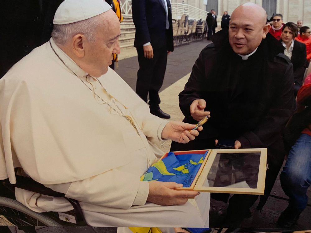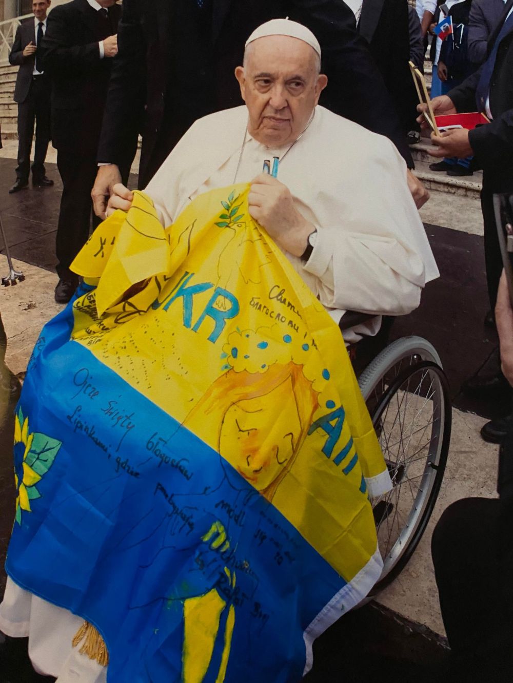 «Передаючи цей прапор, я розповідав Папі про ті емоції і ті дитячі мрії, в яких звучало єдине – мирне небо! Папа був зворушеним», – каже отець.
